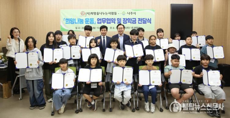 불탑뉴스신문사 송행임 기자 | 전라남도 나주시는 지난 2일 나주시가족센터 배움실에서 사단법인 희망을 나누는 사람들과 ‘2025년 희망나눔 장학금 후원사업’ 업무협약(MOU)을 체결하고 장학금 전달식을 가졌다.