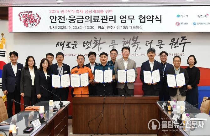 불탑뉴스신문사 차복원 기자 | 원주시는 ‘2025 원주만두축제’의 안전하고 성공적인 개최를 위해 지난 23일 원주경찰서, 원주소방서, 원주세브란스기독병원, 성지병원과 함께 안전·응급의료관리 업무협약을 체결했다.