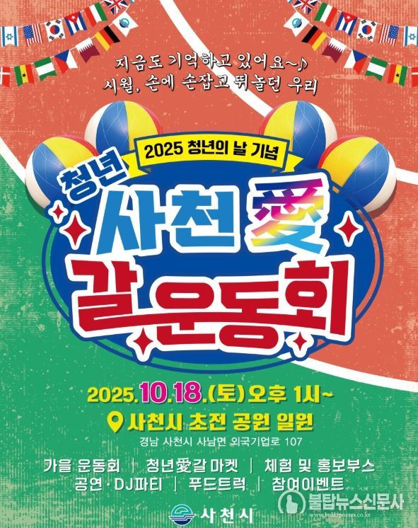 시는 오는 10월 18일 오후 1시부터 초전공원 일원에서 ‘청년 사천愛(애) 갈 운동회’를 열고, 지역 청년들과 시민들이 함께 어울릴 수 있는 기회를 제공한다.