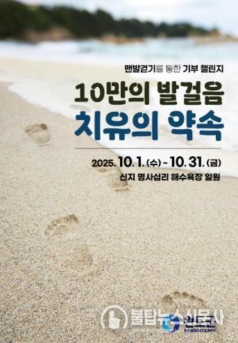 불탑뉴스신문사 차복원 기자 | 완도군은 해양치유센터 이용객 10만 명과 해양기후·문화, 맨발 걷기 등 누적 치유객 50만 명 달성을 기념해 10월 1일부터 31일까지 한 달간 신지 명사십리 해수욕장 일원에서 ‘해양치유 맨발 걷기 나눔 챌린지’를 진행한다.
