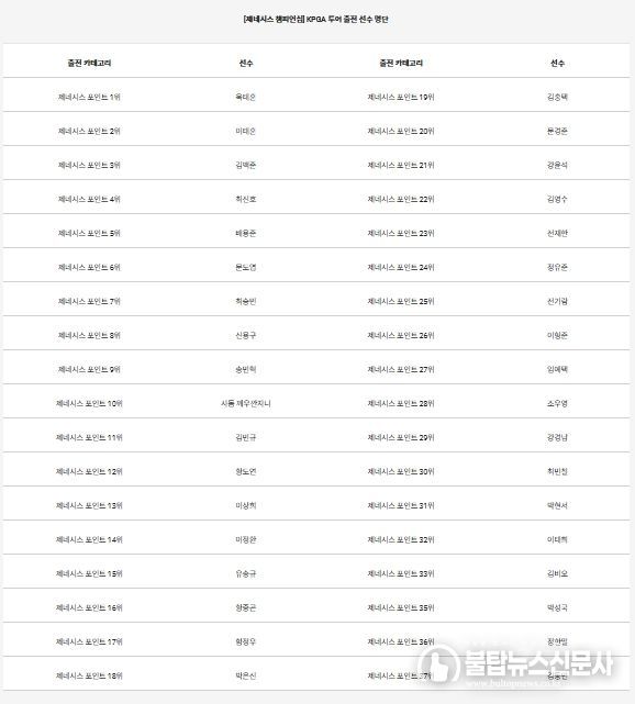 제네시스 포인트 1위 옥태훈(27.금강주택)을 비롯해 2위 이태훈(35.캐나다), 3위 김백준(24.속초아이), 4위 최진호(41.COWELL), 5위 배용준(25.CJ), 6위 문도엽(34.DB손해보험), 7위 최승빈(24.CJ), 8위 신용구(34.금강주택), 9위 송민혁(21.CJ), 10위 사돔 깨우깐자나(27.태국)까지 제네시스 포인트 TOP10 선수들과 36위 정한밀(34.경희), 37위 김동민(27.NH농협은행)까지 제네시스 포인트 상위 36명이 참가자 명단에 이름을 올렸다.