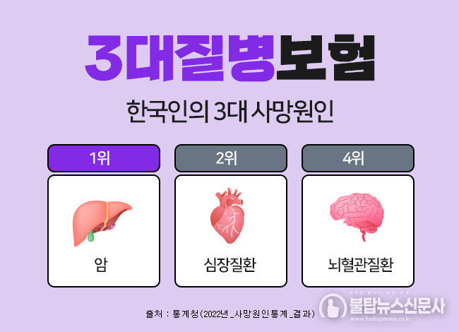 불탑뉴스신문사 차복원 기자 | 3대질병으로 일컬어지는 암, 뇌혈관질환, 심혈관질환은 한국인의 주요 사망원인에서 상위를 차지하고 있으며, 이에 대한 진단비를 집중적으로 보장해 주는 보험상품을 3대질병진단비 보험이라 할 수 있다.