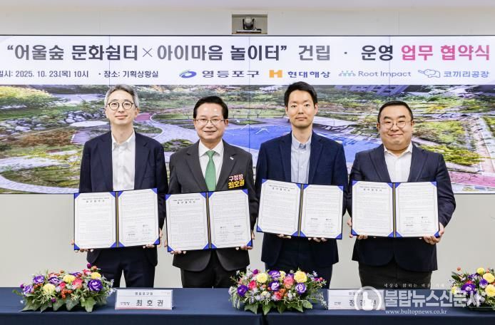 불탑뉴스신문사 차복원 기자 | 영등포구가 10월 23일 현대해상, 루트임팩트, 코끼리공장과 함께 ‘어울숲 문화쉼터×아이마음 놀이터’ 건립과 운영을 위한 다자간 업무협약을 체결했다고 밝혔다.