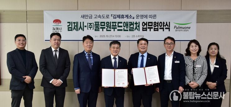불탑뉴스신문사 송행임 기자 | 김제시는 27일 ㈜풀무원푸드앤컬처와 '새만금전주간' 고속도로 개통에 따라 새롭게 조성되는‘김제휴게소’운영에 따른 업무협약을 체결했다고 밝혔다.