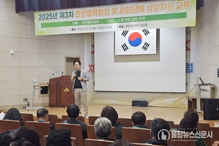 불탑뉴스신문사 차복원 기자 | 의성군은 10월 27일 종합복지관 대강당에서 관내 사회단체 임원 및 실무자 등 70여 명이 참석한 가운데 ‘2025년 제3차 민관협력회의 및 성장지원교육’을 개최했다고 밝혔다.