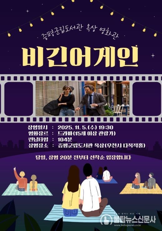 불탑뉴스신문사 차복원 기자 | 충북 증평군립도서관이 오는 11월 5일 오후 7시 30분, 도서관 옥상야외 공간에서 영화 ‘비긴 어게인(Begin Again, 존 카니 감독)’을 상영한다.