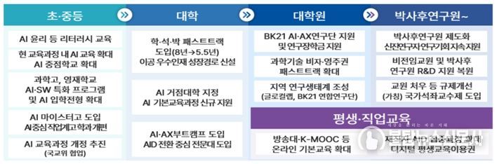 이공 우수인재 성장경로 지원사업을 신설하여, 우수한 학부생들이 교수들의 밀착 지원을 받으며 조기에 연구 프로젝트 등에 참여하고 걱정 없이 학업에 몰두할 수 있도록 연간 2,000만 원 수준의 학업 장려금을 지원한다. 2026년부터 400명을 선정할 계획이며, 향후 우수 학부생이 박사후 단계까지 안정적으로 성장할 수 있도록 지원 범위를 늘려나갈 예정이다. 두뇌한국(BK) 21 사업 인공지능(AI) 교육연구단도 확대하여 인공지능(AI) 석‧박사 인재를 양성한다.