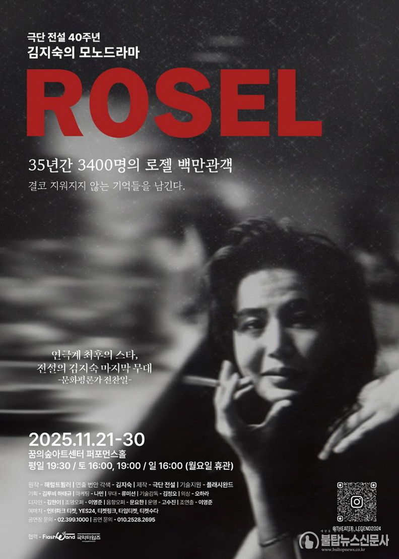 불탑뉴스신문사 송행임 기자 | 극단 전설 40주년 기념작이자 배우 김지숙의 마지막 공연인 모노드라마 〈로젤〉이 오는 11월 21일부터 30일까지 꿈의숲아트센터 퍼포먼스홀에서 막을 올린다. 35년간 3,400회 이상 공연되며 백만 명이 넘는 관객을 울린 이 작품은 여성의 주체성과 인간성의 회복을 그린 한국 연극사의 대표작으로 꼽힌다.