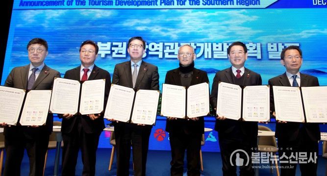 전라남도에 따르면 문화체육관광부는 22일 통영국제음악당에서 전남도와 경남도, 부산시, 광주시, 울산시 등 남부권 5개 시·도와 함께 10년간 총 3조 원을 투자하는 단계별 ‘남부권 광역관광 개발계획’을 발표했다. 전남엔 1조 3천억이 투입돼 56개 사업을 추진한다. 개도 이래 최장·최대 규모다.