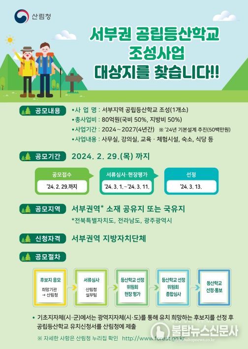 불탑뉴스신문사 송행임 기자 | 산림청은 지역별 균형있는 등산 교육이 제공될 수 있도록서부권역(전라도 지역) 공립등산학교 조성사업에 참여할 지방자치단체를 2월 29일까지 모집한다고 밝혔다.