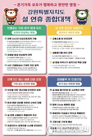 이 밖에도 명절 전 건설근로자 임금 및 하도급대금 적기 지급을 위한 특별 점검, 도‧시군 감염병 발생 대응 비상방역 체계 유지, ASF·AI·구제역 차단 강화를 위한 26개 방역대책상황실 운영 등 각종 대책을 병행 추진하여 분야별 틈새 없는 설 연휴를 준비할 방침이다.