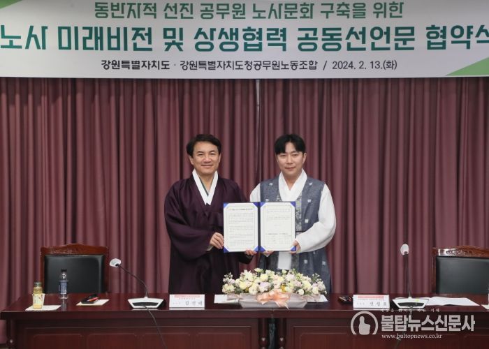 불탑뉴스신문사 차복원 기자 | 강원특별자치도와 강원특별자치도청공무원노동조합은 2월 13일 오전 11시 30분 노조간부 및 직원들이 참석한 가운데 '노사간 미래비전 공유 및 상생협력을 위한 공동 선언문' 협약식을 가졌다.