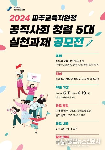 불탑뉴스신문사 차복원 기자 | 경기도파주교육지원청은 우리 사회의 청렴 문화에 대한 관심을 높이고, 직접 참여하는 청렴 문화 조성을 위하여 파주교육지원청 관내 학생, 학부모, 교직원, 파주시민을 대상으로 『공직사회 청렴 5대 실천과제 표어 공모전』을 실시한다고 밝혔다.