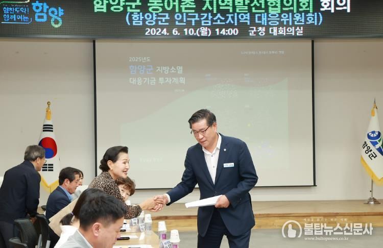 불탑뉴스신문사 송행임 기자 | 함양군은 10일 오후 2시 군청 대회의실에서 진병영 군수와 발전협의회(위원장 이영재) 위원 등 30여 명이 참석한 가운데 ‘함양군 농어촌 지역발전협의회’를 개최했다.