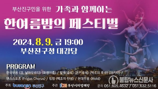 불탑뉴스신문사 송행임 기자 | 부산 부산진구는 오는 8월 9일 오후 7시, 부산진구청 대강당에서 부산진예술 기획공연 ‘가족과 함께하는 한여름밤의 페스티벌’을 개최한다고 밝혔다.