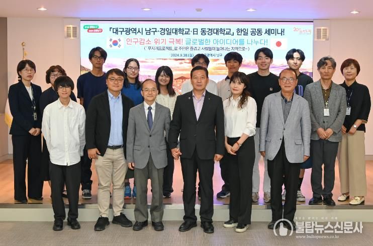 불탑뉴스신문사 차복원 기자 | 대구 남구는 지난 9월 30일, 일본 동경대학교(경제학) 교수와 재학생 8명, 경일대학교(스마트경영학부) 배영자 교수를 비롯한 관계자들이 남구청을 방문하여 ‘대구 남구의 인구소멸 대응’에 대한 공동세미나를 개최하고, 앞산해넘이전망대 등을 탐방했다고 밝혔다.