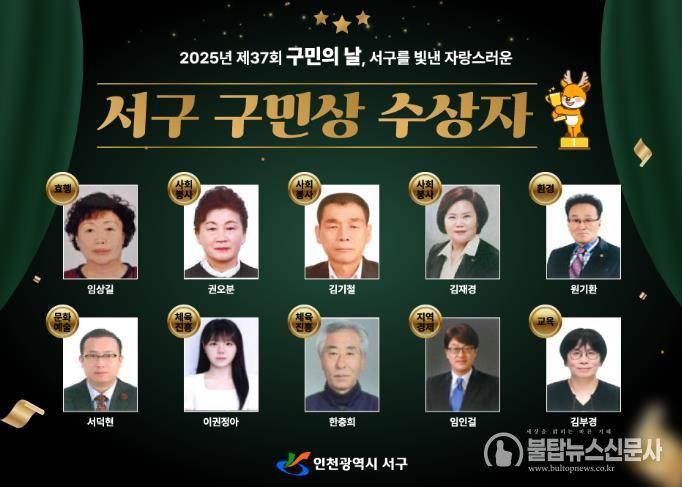불탑뉴스신문사 차복원 기자 | 인천 서구는 제37회 구민의 날을 맞아 지역사회 발전과 구민 화합에 헌신한 2025년 구민상 수상자 10명을 선정했다고 2일 밝혔다.