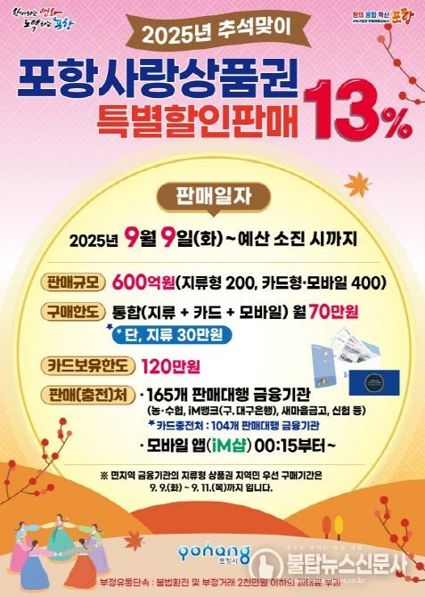 불탑뉴스신문사 차복원 기자 | 포항시는 추석 명절을 앞두고 골목상권 소비 촉진과 지역경제 활력 제고를 위해 오는 9일부터 포항사랑상품권 600억 원을 13% 특별할인 판매한다고 밝혔다.