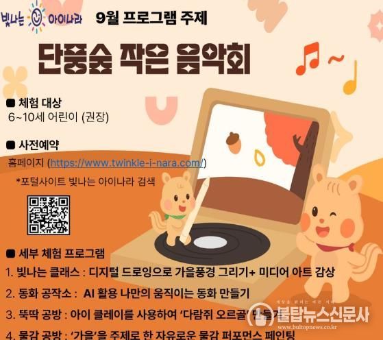 프로그램 세부 내용은 ▲디지털 드로잉을 활용한 가을풍경 그리기(빛나는 클래스) ▲자신이 그린 그림을 아트 캔버스에서 감상할 수 있는 미디어아트 체험(빛의 갤러리) ▲AI를 활용한 나만의 움직이는 동화 만들기(동화공작소) ▲아이클레이를 활용한 ‘다람쥐 오르골’ 만들기(뚝딱공방) ▲유리 벽면을 활용해 ‘가을’을 주제로 한 자유로운 물감 퍼포먼스 페인팅(물감 공방) 등으로 가을 정취를 느낄 수 있도록 마련했다.