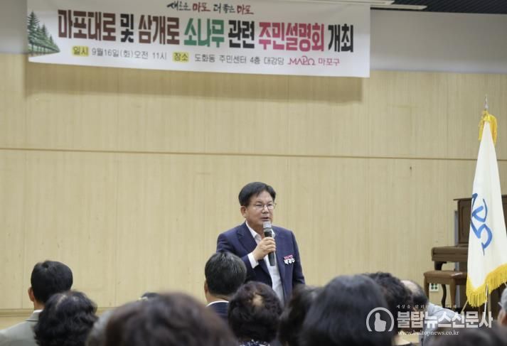불탑뉴스신문사 차복원 기자 | 마포구는 9월 16일 오전 11시, 도화동 주민센터 4층 대강당에서 도화동을 포함한 인근 주민 100여 명이 참석한 가운데 ‘마포대로 및 삼개로 소나무 관련 주민설명회’를 개최했다.