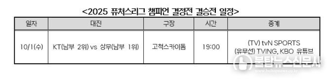 퓨처스리그 초대 챔피언이 결정될 결승전은 10월 1일(수) 오후 7시 고척스카이돔에서 열리며, 결승전은 TVING과 tvN SPORTS 및 KBO 유튜브를 통해 중계된다.