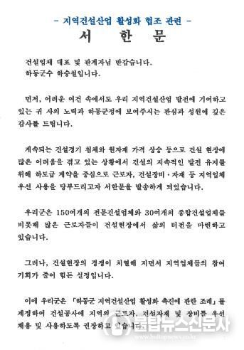 하승철 하동군수는 서한문을 통해 “지역 건설의 지속적인 발전 유지를 위해 하도급 계약을 중심으로 근로자, 건설장비·자재 등 지역업체를 우선 사용해 달라”고 요청했다.