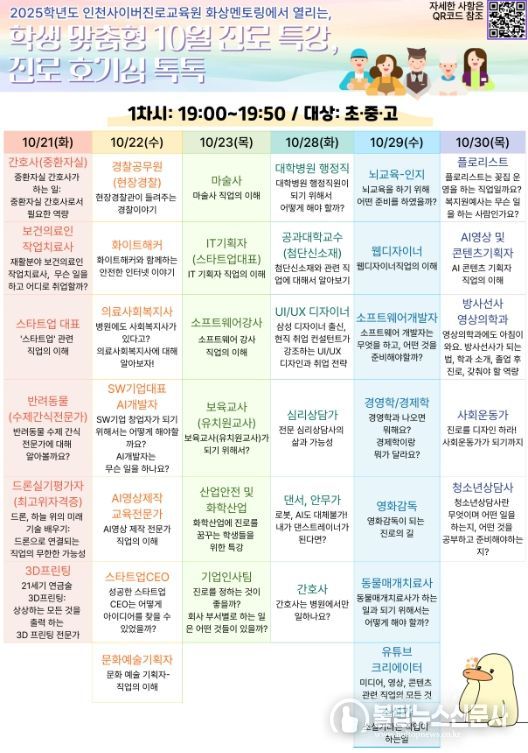 강의는 오후 7시와 8시 두 차시로 진행되며, 인천시교육청 진로·직업 멘토단 2,000명이 강사로 참여해 초·중·고 학생들에게 생생한 진로·직업 정보를 제공한다.