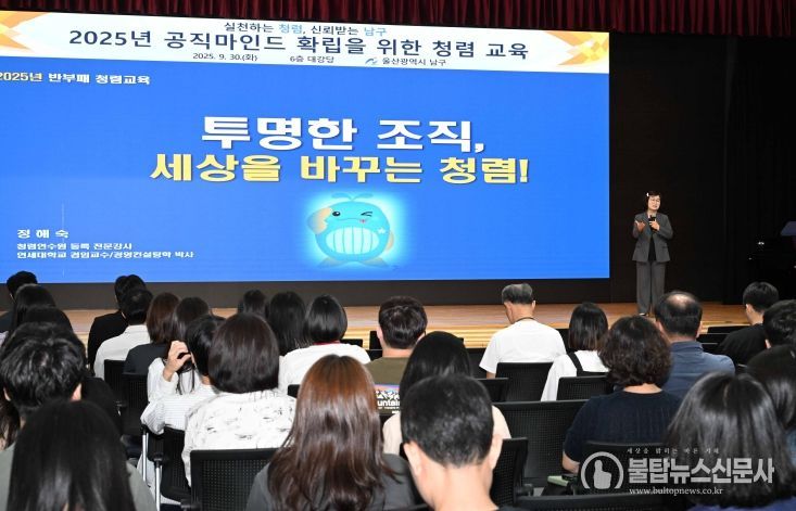 불탑뉴스신문사 차복원 기자 | 울산 남구는 30일 구청 6층 대강당에서 전 직원 대상으로‘공직마인드 확립을 위한 제2차 청렴교육’을 실시했다.
