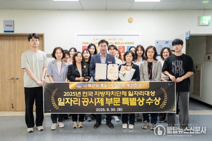 불탑뉴스신문사 송행임 기자 | 부산 부산진구가 고용노동부 주관 ‘2025 전국 지방자치단체 일자리대상’ 지역일자리 목표 공시제 부문에서 특별상을 수상했다고 밝혔다.