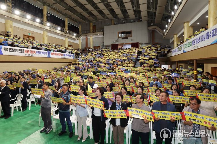 불탑뉴스신문사 차복원 기자 | 무주군이 지난 1일 무주예체문화관 대강당에서 농어촌 기본소득 시범사업 선정을 촉구하는 범군민 결의대회를 개최했다.