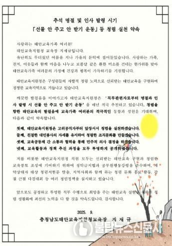 불탑뉴스신문사 차복원 기자 | 충청남도태안교육지원청은 추석 연휴 시기를 맞아 청렴한 공직문화를 확산하기 위해 ‘선물 안 주고 안 받기 운동’을 강조하는 청렴 서한문을 홈페이지에 게시했다.