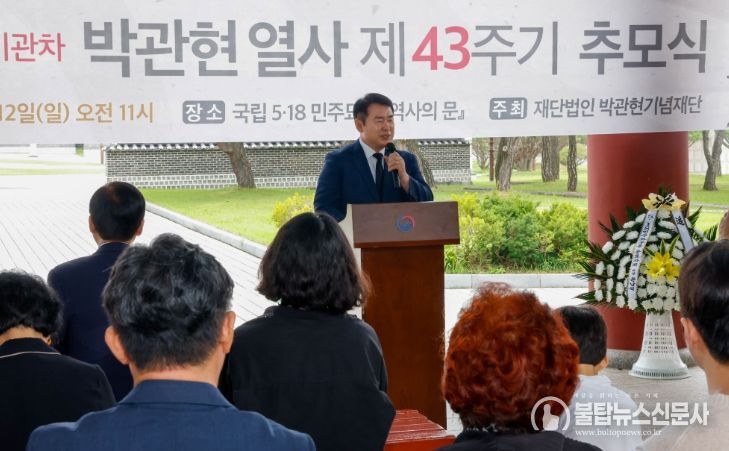 불탑뉴스신문사 차복원 기자 | 이정선 광주시교육감이 12일 국립5·18민주묘지 ‘역사의 문’ 앞에서 열린 ‘민주화의 새벽기관차 박관현 열사 제43주기 추모식’에 참석했다.