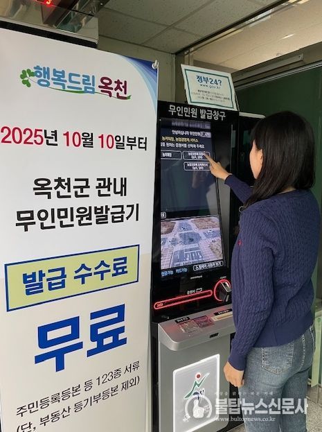 불탑뉴스신문사 차복원 기자 | 옥천군은 군민들의 민원 편의를 높이기 위해 무인민원발급기에서 발급하는 제증명 수수료를 전면 무료로 전환했다.