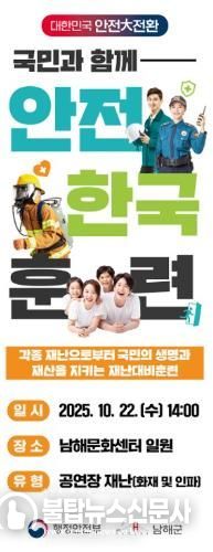 불탑뉴스신문사 송행임 기자 | 남해군은 각 기관의 협업체계와 현장 대응능력을 점검하기 위해 오는 10월 22일 남해문화센터 일원에서 ‘2025년 재난대응 안전한국훈련’을 실시한다고 밝혔다.