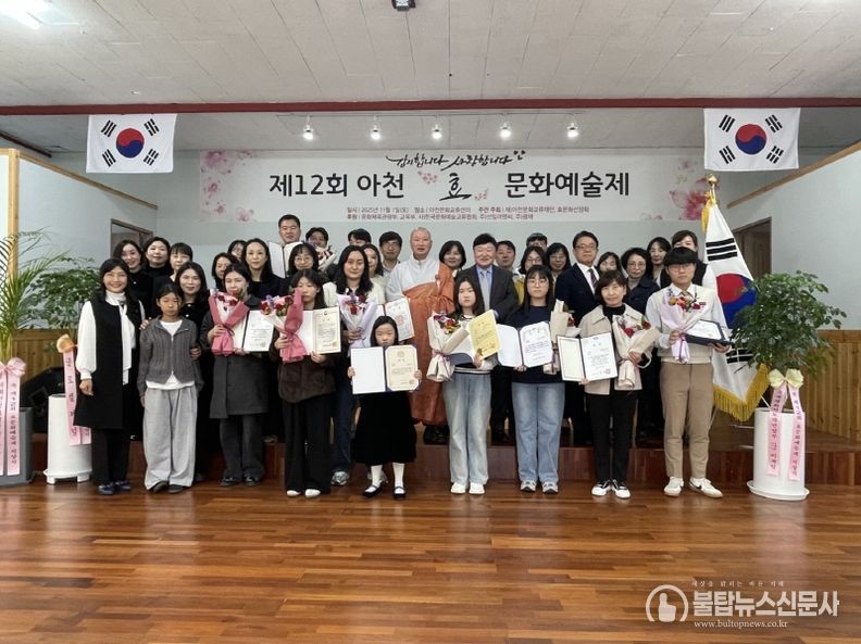 불탑뉴스신문사 송행임 기자 | 재단법인 아천문화교류재단(ACEF)이 주최-주관한 '제12회 아천효문화예술제’가 11월 1일 오후3시 아천문화교류센터에서 시상식이 개최됐다. 이날 행사에는 부모사랑 나라사랑의 올바른 가치관을 심어주기 위해 문화예술 부문의 우수한 인재들을 발굴 시상하고 올해로 12회를 맞았다.