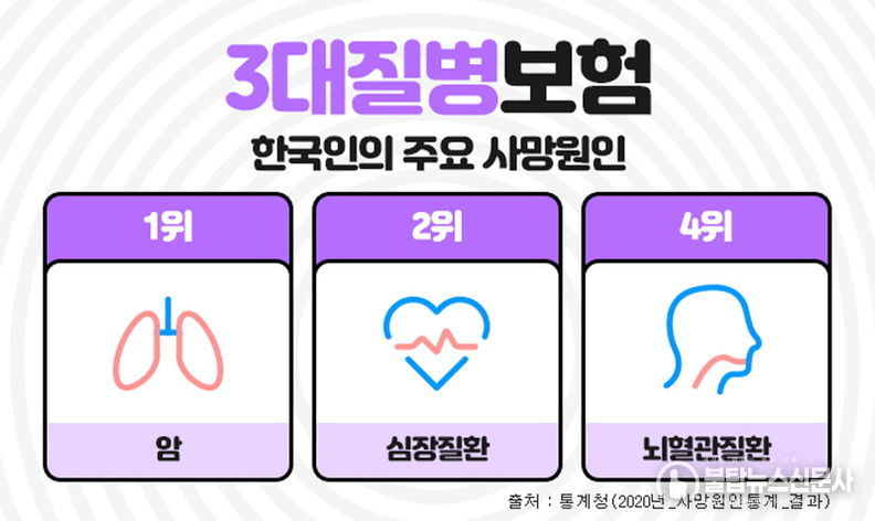 불탑뉴스신문사 차복원 기자 | 한국인의 주요 사망원인중에 암, 뇌혈관질환, 심혈관질환은 흔히 3대질병이라 일컬어지며 살아가면서 가장 먼저 대비해야 하는 중대질병으로 항상 강조되고 있다. 이들 질병에 미리 대비하기 위해 가입하는 것이 진단비보험인데, 이러한 3대질병진단비를 중점으로 보장하는 보장성보험이 3대진단비보험 이다. 3대질병진단비보험은 각각의 질병에 주목해서 보장하기도 하지만, 나에게 맞는 추가 특약을 잘 골라서 가입한다면 종합건강보험으로도 충분히 활용도가 높다.