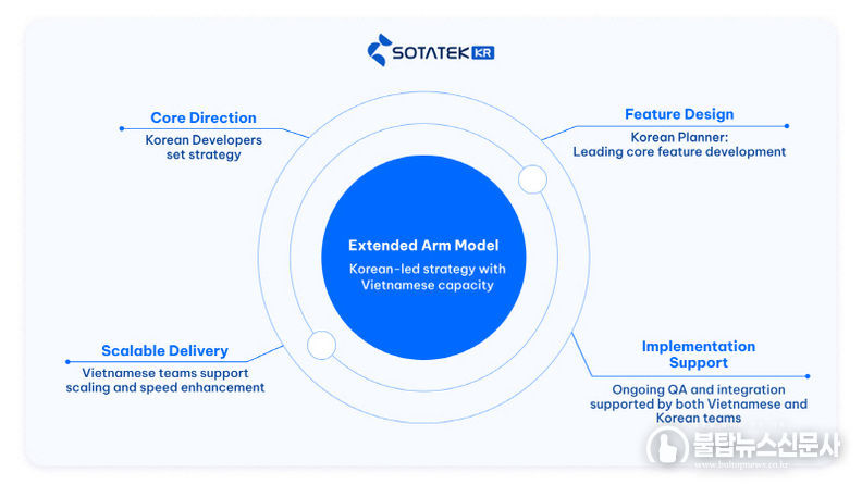 불탑뉴스신문사 차복원 기자 | 한국에서 IT 인력 부족 현상이 지속되는 가운데, 베트남 개발자를 국내 개발팀의 '확장된 팔(extended arm)'로 활용하는 모델이 한국 SI 기업과 기술기업에게 중요한 전략적 해법으로 떠오르고 있다. 다만 이 모델이 효과적으로 운영되기 위해서는 각 팀의 역할을 명확히 구분하고, 빠르게 변하는 한국 시장의 특성에 맞게 적응하는 것이 필수적이다. SotaTek Korea는 오랜 경험과 한국 업무 문화에 맞춘 조직 구조 덕분에 이 결합 모델을 성공적으로 구현한 몇 안 되는 베트남 기업 중 하나로 평가된다.