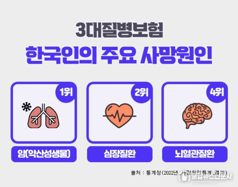불탑뉴스신문사 차복원 기자 | 흔히 3대질병이라 일컫는 암, 심혈관질환, 뇌혈관질환은 통계청 발표자료에 따르면 한국인의 주요 사망원인 중에서 3위 폐렴을 제외하고 1~4위를 차지하고 있으며, 이전부터 지금까지도 살면서 가장 먼저 대비해야 하는 치명적인 질병으로 강조되고 있다. 이러한 중대질병에 대비하기 위하여 상기 세가지 치명적인 질병을 집중보장하는 3대질병진단비보험을 많이 가입하고 있다. 3대진단비보험은 각각의 질병을 중점적으로 보장하면서도 가입자 특성에 맞는 특약을 추가함으로써 종합건강보험으로도 활용할 수가 있다.