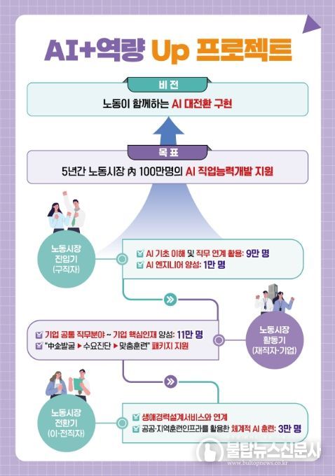 새로운 도전을 준비하는 중장년 등 이·전직 준비자에게는 공공직업교육훈련기관인 폴리텍을 통해 AI 기초활용교육(2.8만명)뿐만 아니라 전문 AX 훈련(1천명)을 제공하고, 지역을 중심으로 AI를 활용한 직무 전환 훈련도 새롭게 지원할 예정이다.