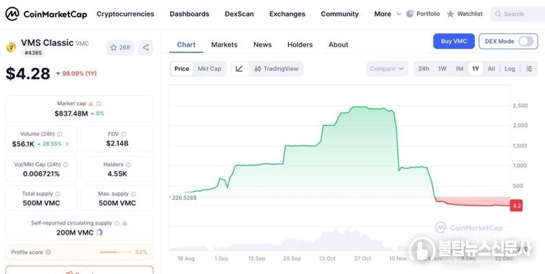 출금정지처분의 결정적 요인은 자체 발행한 VMC 코인이 불법매도된 사건이다. 2025년7월에 최초 미국 거래소인 Bitmart 에 상장한 VMC 는 상장가 $10을 시작으로 높은 상장 시작가임에도 불구하고 2개월만에 $600 대를 돌파했다. 사건이 터지기 11월4일 전까지는 $2,400 까지 넘어서는 놀라운 기록을 보였지만 결국 불법매도가 시작된 LBank 가 빅토리아 거래소를 금융당국에 신고하면서 현재는 상장가 미만으로 가격이 폭락하게 되는 희대의 사건으로 전락하고 말았다.