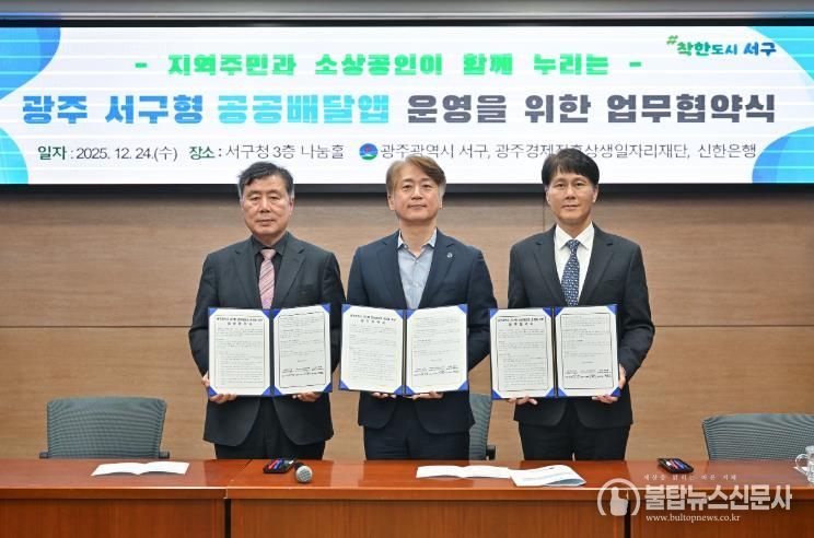 서구는 광주경제진흥상생일자리재단, ㈜신한은행 땡겨요 사업단과 ‘서구형 공공배달앱 운영을 위한 업무협약’을 체결하고, 온라인 배달 소비 영역까지 골목경제 회복 정책을 확대한다고 밝혔다.