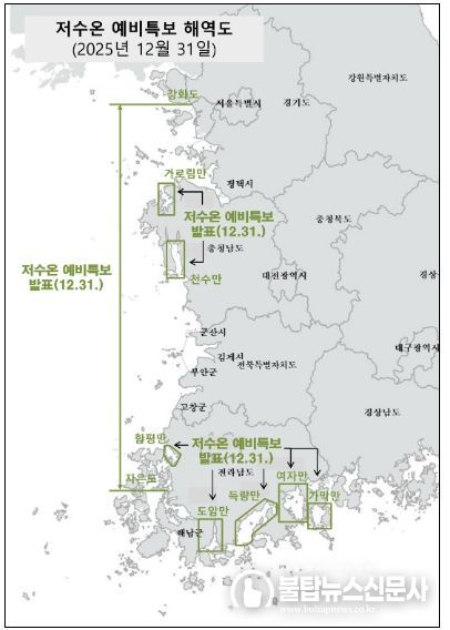 불탑뉴스신문사 차복원 기자 | 해양수산부는 12월 31일 15시부로 저수온 위기경보* ‘주의’ 단계를 발령했다고 밝혔다.