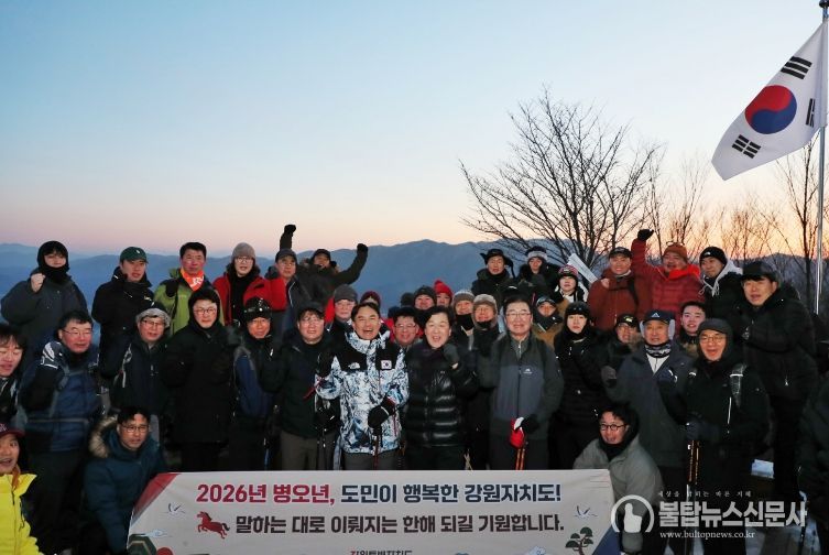 불탑뉴스신문사 차복원 기자 | 김진태 강원특별자치도지사는 2026년 1월 1일 새해 첫 일정으로 도청 실국장 및 직원 30여 명과 함께 금병산에서 해맞이 산행을 진행했다.