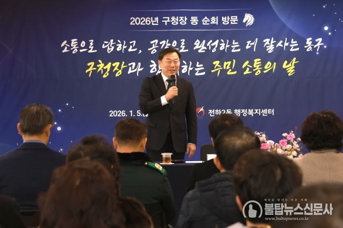 김종훈 동구청장은 1월 5일 전하2동 행정복지센터와 전하1동 행정복지센터 방문을 시작으로 관내 동 순회 방문을 시작했다. 2026년 구정 운영 방향 안내, 주민 건의 사항 질의‧답변, 새해 인사 및 덕담의 시간 등을 통해 주민과 소통하는 시간을 가졌다.