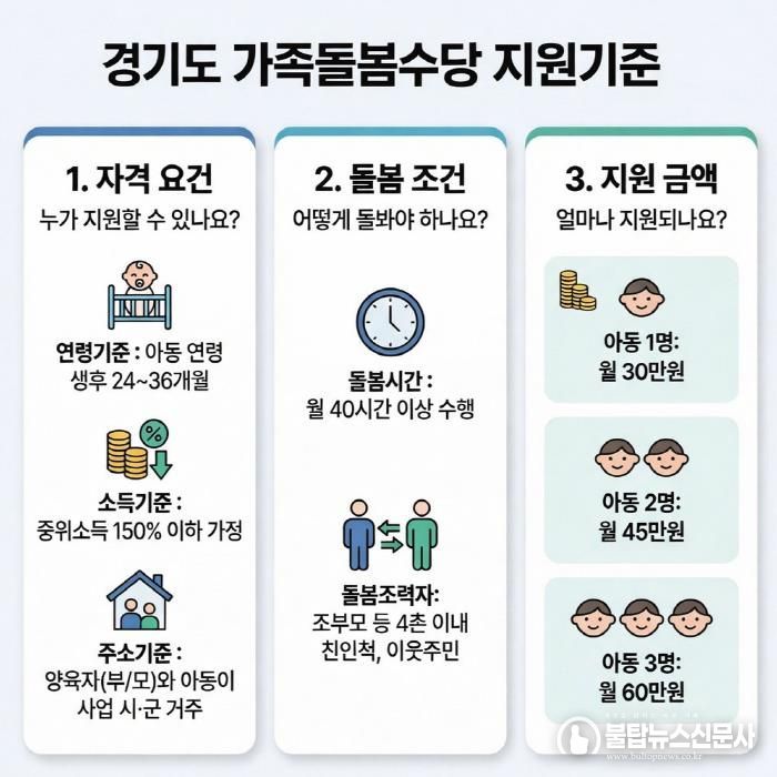 신청은 매월 1일부터 15일까지 경기민원24를 통해 온라인으로 가능하며, 돌봄활동 후 그다음 달에 수당이 지급된다.
