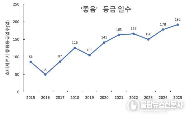 31개 시군 111개 도시대기측정소 측정 결과, 초미세먼지 ‘좋음’ 등급 일수도 종전 최저치였던 2024년(178일)보다 14일 늘어난 192일로 집계됐다. 대기환경 기준 초미세먼지 농도가 15μg/m3 이하일 때 ‘좋음’ 등급으로 분류한다.