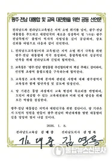 불탑뉴스신문사 차복원 기자 | 전라남도교육청과 전라남도가 광주·전남 대통합과 교육 대전환을 위한 공동선언문을 발표했다.
