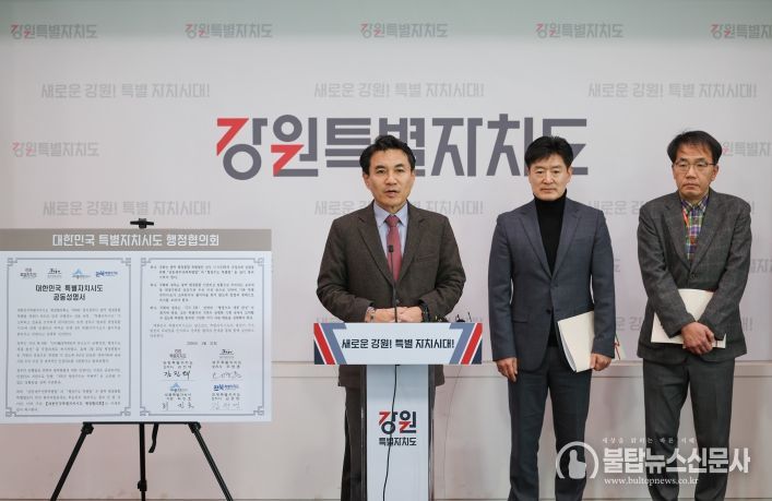 불탑뉴스신문사 차복원 기자 | 강원, 제주, 세종, 전북으로 구성된 ‘대한민국특별자치시도 행정협의회’(대표회장 : 김진태 강원특별자치도지사)는 1월 21일 4개 특별자치시‧도의 특별법안 조속한 통과와 광역 행정통합 인센티브 부여에 따른 역차별 우려를 담은 공동성명서를 발표했다.