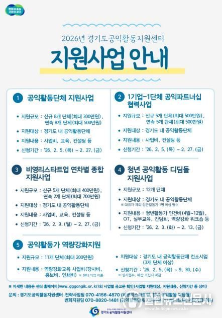 불탑뉴스신문사 차복원 기자 | 경기도공익활동지원센터가 ‘2026년 경기도 공익활동 지원사업’에 참여할 도내 공익활동 단체를 모집한다.