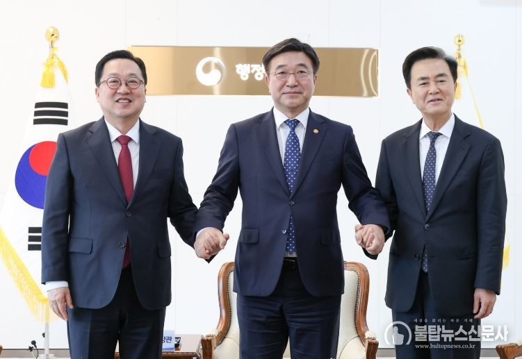 불탑뉴스신문사 차복원 기자 | 이장우 대전시장은 6일 오후 4시 정부세종청사에서 윤호중 행안부 장관, 김태흠 충남지사와 간담회를 갖고, 대전․충남 행정통합 특별법의 원안 관철을 정부에 촉구하며 관련 건의문을 공식 전달했다.